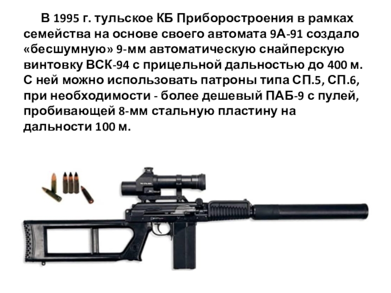 семейства на основе своего автомата 9А-91 создало «бесшумную» 9-мм автоматическую снайперскую винтовку ВСК-94 с прицельной дальностью до 400 м. С ней можно использовать патроны типа СП.5, СП.6, при необходимости - более дешевый ПАБ-9 с пулей, пробивающей 8-мм стальную пластину на дальности 100 м.