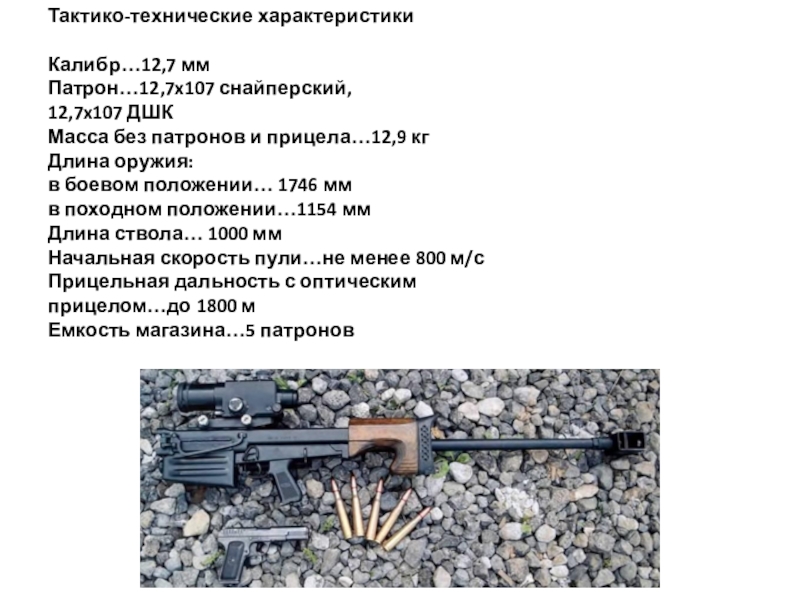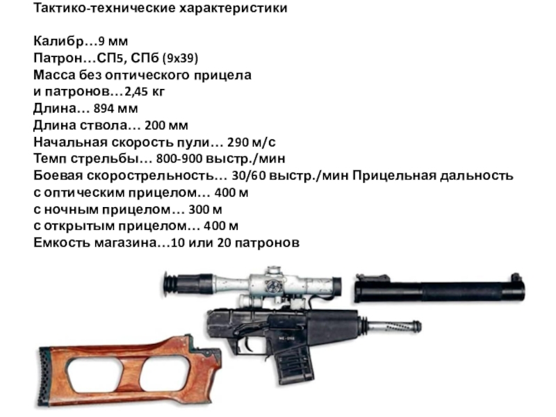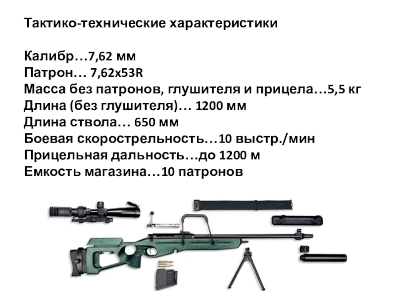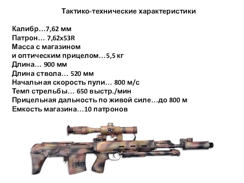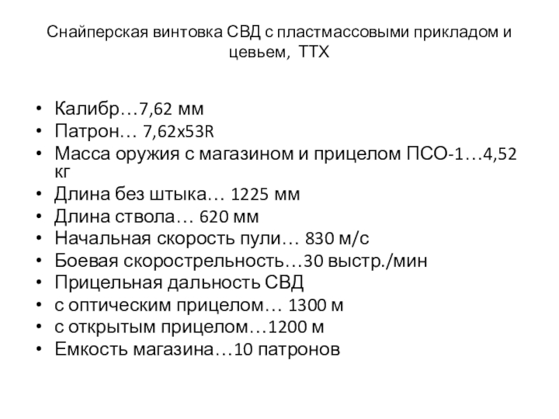 Слайд 23Снайперская винтовка СВД с пластмассовыми прикладом и цевьем, ТТХ