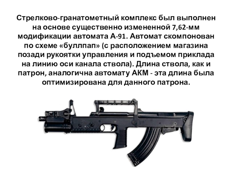 Слайд 18Стрелково-гранатометный комплекс был выполнен на основе существенно измененной 7,62-мм модификации автомата