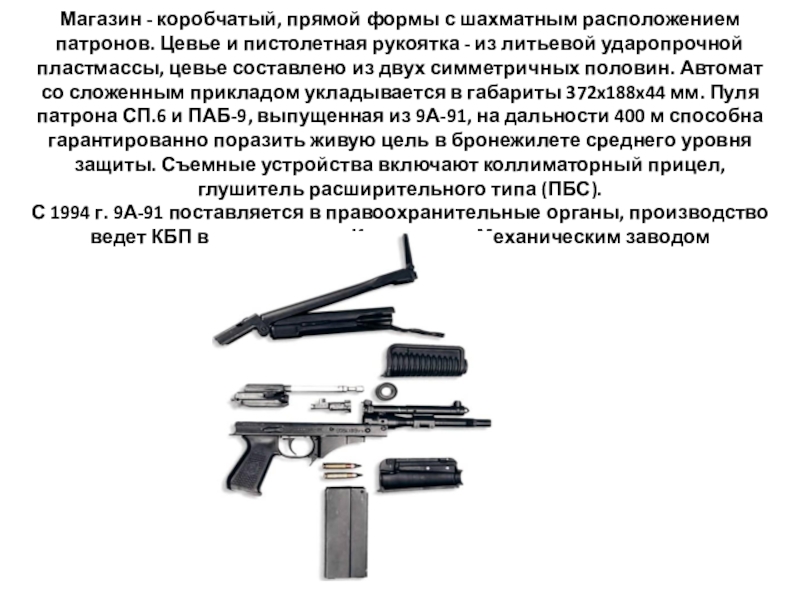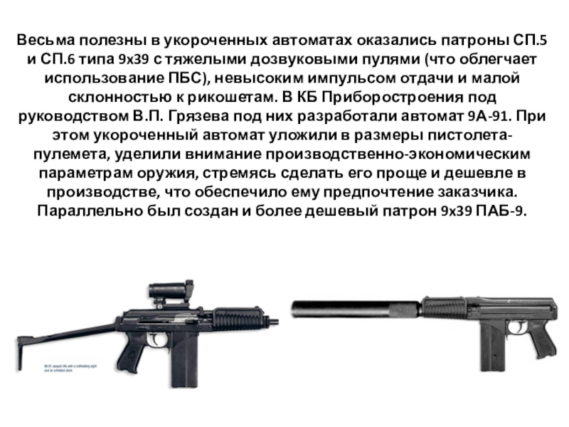 9x39 с тяжелыми дозвуковыми пулями (что облегчает использование ПБС), невысоким импульсом отдачи и малой склонностью к рикошетам. В КБ Приборостроения под руководством В.П. Грязева под них разработали автомат 9А-91. При этом укороченный автомат уложили в размеры пистолета-пулемета, уделили внимание производственно-экономическим параметрам оружия, стремясь сделать его проще и дешевле в производстве, что обеспечило ему предпочтение заказчика. Параллельно был создан и более дешевый патрон 9x39 ПАБ-9.