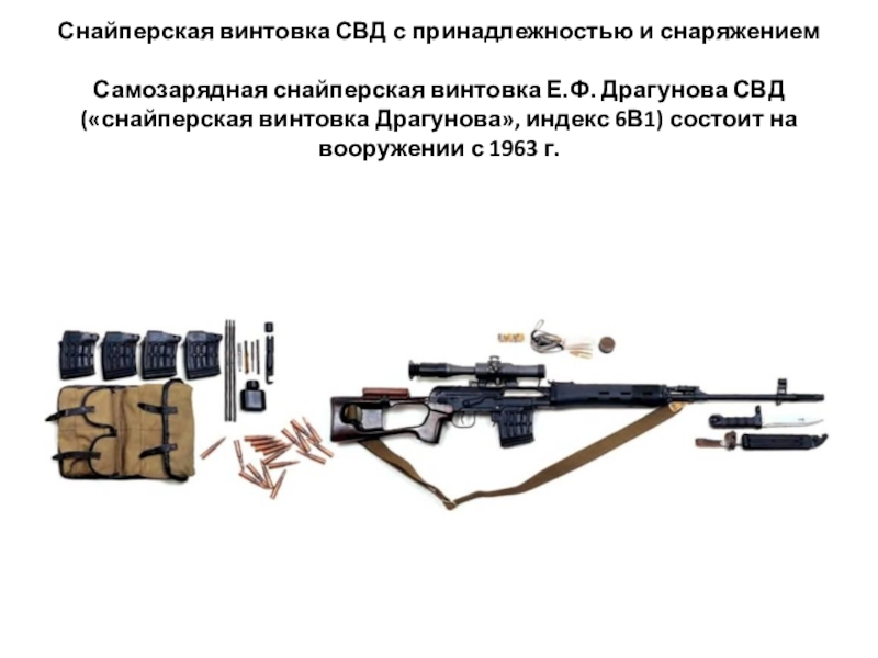 СВД («снайперская винтовка Драгунова», индекс 6В1) состоит на вооружении с 1963 г.