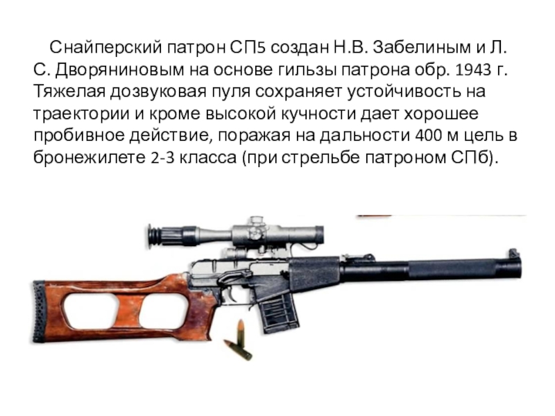 Слайд 33 Снайперский патрон СП5 создан Н.В. Забелиным и Л.С. Дворяниновым