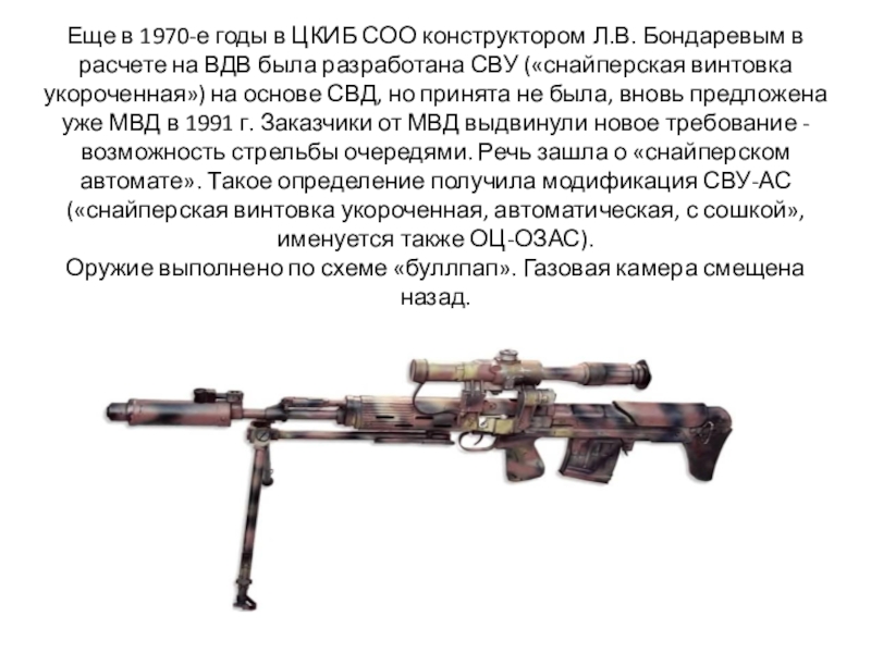 расчете на ВДВ была разработана СВУ («снайперская винтовка укороченная») на основе СВД, но принята не была, вновь предложена уже МВД в 1991 г. Заказчики от МВД выдвинули новое требование - возможность стрельбы очередями. Речь зашла о «снайперском автомате». Такое определение получила модификация СВУ-АС («снайперская винтовка укороченная, автоматическая, с сошкой», именуется также ОЦ-ОЗАС).