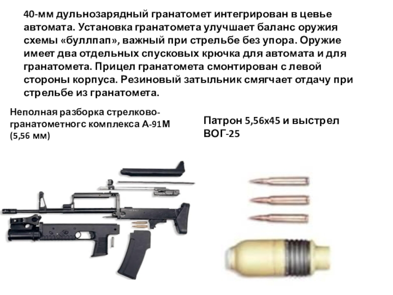 Слайд 1940-мм дульнозарядный гранатомет интегрирован в цевье автомата. Установка гранатомета улучшает баланс