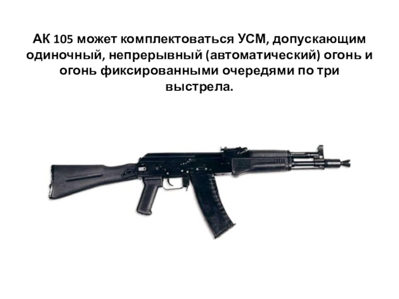 Слайд 12АК 105 может комплектоваться УСМ, допускающим одиночный, непрерывный (автоматический) огонь и