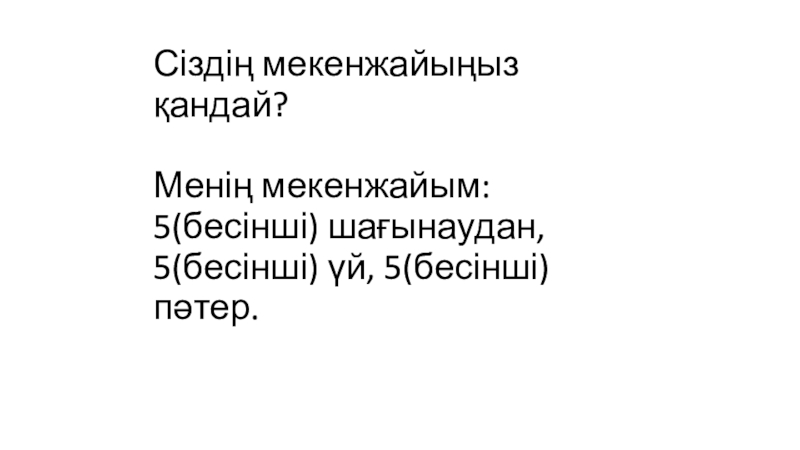 Менің мекенжайым: 5(бесінші) шағынаудан, 5(бесінші) үй, 5(бесінші) пәтер.
