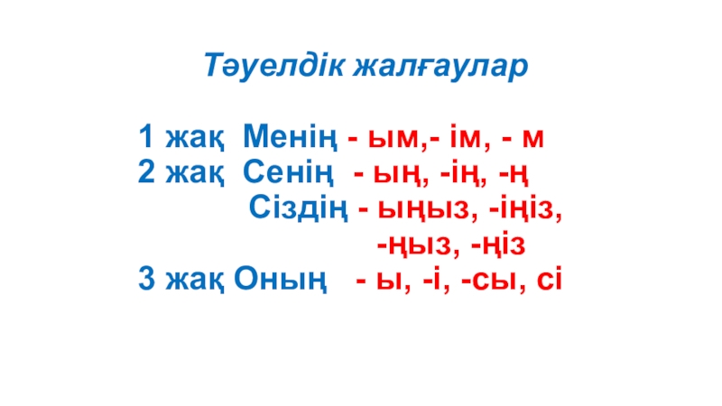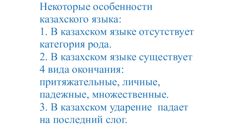 казахском языке существует 4 вида окончания: притяжательные, личные, падежные, множественные.