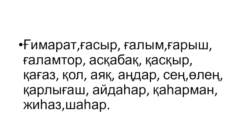 Слайд 43Ғимарат,ғасыр, ғалым,ғарыш, ғаламтор, асқабақ, қасқыр,қағаз, қол, аяқ, аңдар, сең,өлең, қарлығаш, айдаһар,