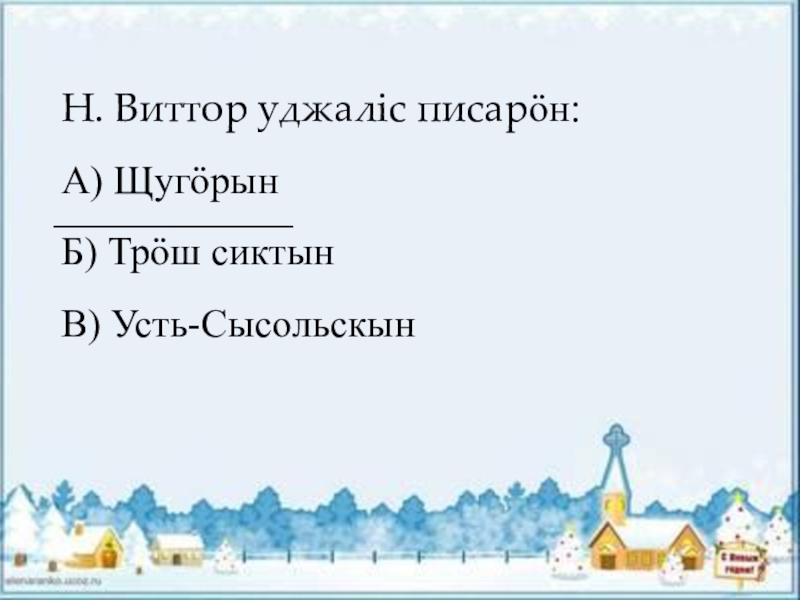 Н. Виттор уджалiс писарӧн:А) ЩугӧрынБ) Трӧш сиктынВ) Усть-Сысольскын