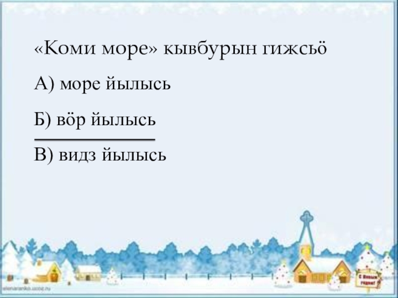 «Коми море» кывбурын гижсьӧА) море йылысьБ) вӧр йылысьВ) видз йылысь