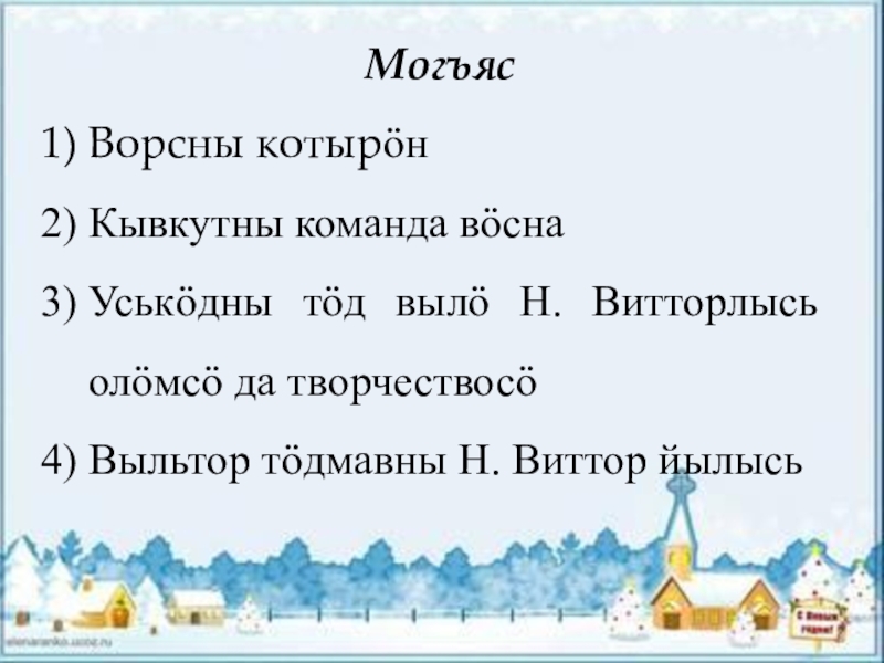 Презентация, доклад на тему Урок-игра по теме: Небдiнса Витторлы сиӧм командаясӧн ворсӧм