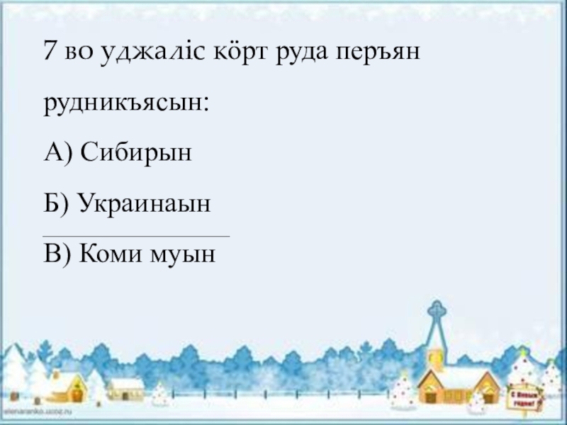 7 во уджалiс кӧрт руда перъян рудникъясын:А) СибирынБ) УкраинаынВ) Коми муын