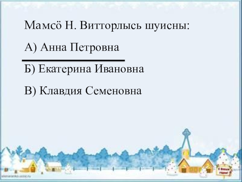 Мамсӧ Н. Витторлысь шуисны:А) Анна ПетровнаБ) Екатерина ИвановнаВ) Клавдия Семеновна