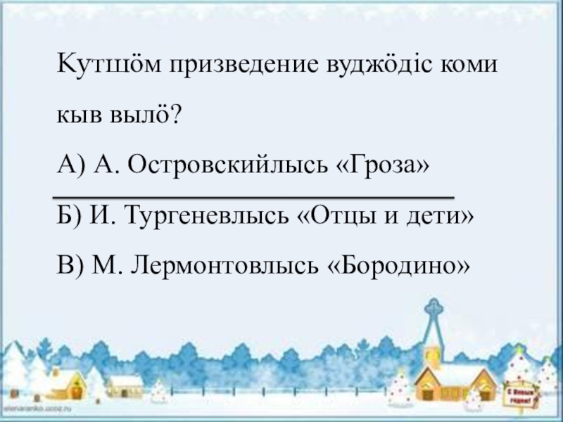 Кутшӧм призведение вуджӧдiс коми кыв вылӧ?А) А. Островскийлысь «Гроза»Б) И. Тургеневлысь «Отцы и дети»В) М. Лермонтовлысь «Бородино»