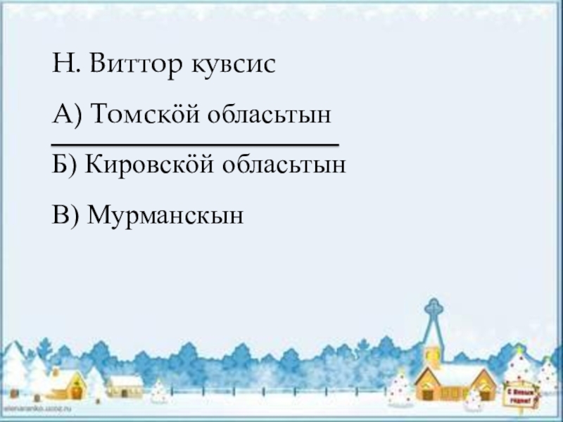 Н. Виттор кувсисА) Томскӧй обласьтынБ) Кировскӧй обласьтынВ) Мурманскын