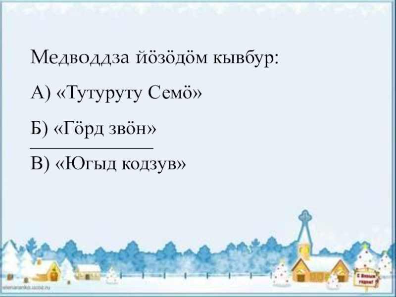 Медводдза йӧзӧдӧм кывбур:А) «Тутуруту Семӧ»Б) «Гӧрд звӧн»В) «Югыд кодзув»