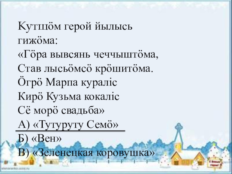 Кутшӧм герой йылысь гижӧма:«Гӧра вывсянь чеччыштӧма,Став лысьӧмсӧ крӧшитӧма.Ӧгрӧ Марпа куралiсКирӧ Кузьма кокалiсСё морӧ свадьба»А) «Тутуруту Семӧ»Б) «Вен»В)