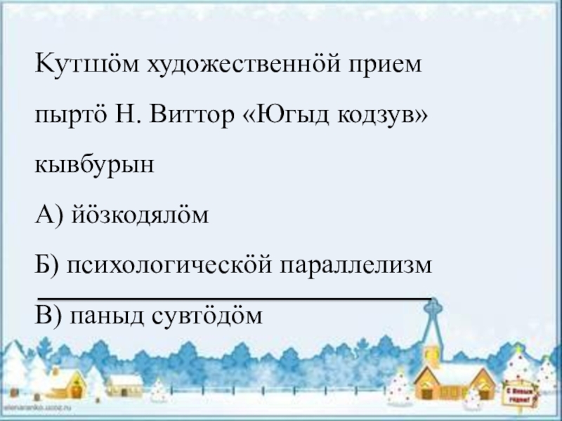 Кутшӧм художественнӧй прием пыртӧ Н. Виттор «Югыд кодзув» кывбурынА) йӧзкодялӧмБ) психологическӧй параллелизмВ) паныд сувтӧдӧм