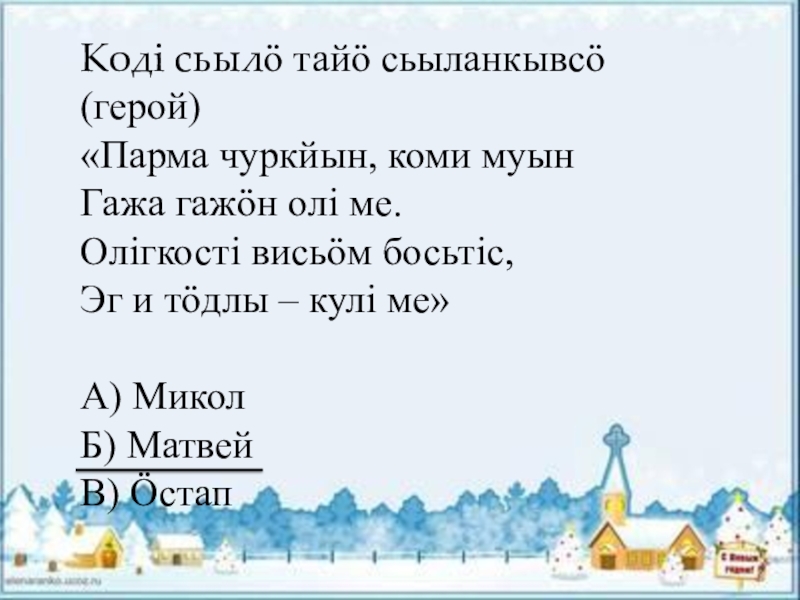 Слайд 13Кодi сьылӧ тайӧ сьыланкывсӧ (герой)
