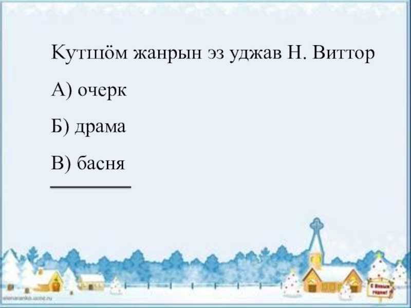 Кутшӧм жанрын эз уджав Н. ВитторА) очеркБ) драмаВ) басня