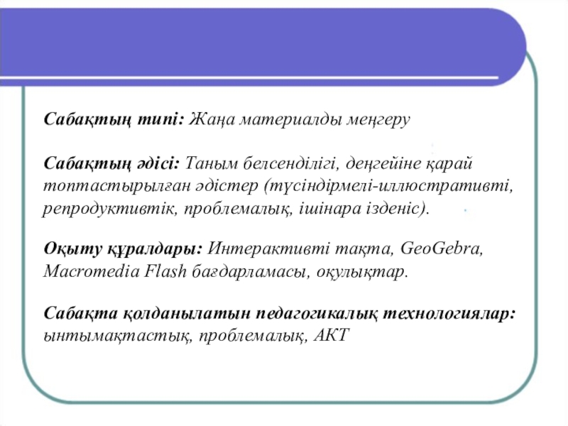 Оқыту құралдары: Интерактивті тақта, GeoGebra, Macromedia Flash бағдарламасы, оқулықтар.