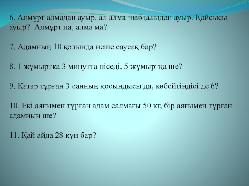 Слайд 206. Алмұрт алмадан ауыр, ал алма шабдалыдан ауыр. Қайсысы ауыр? Алмұрт