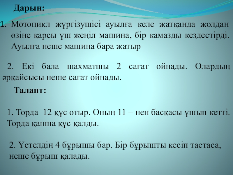 1. Торда 12 құс отыр. Оның 11 – нен басқасы ұшып кетті.