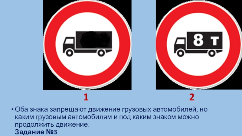 Оба знака запрещают движение грузовых автомобилей, но каким грузовым автомобилям и под каким знаком можно продолжить движение. Задание №3