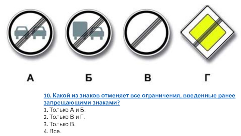 Слайд 1810. Какой из знаков отменяет все ограничения, введенные ранее запрещающими знаками?