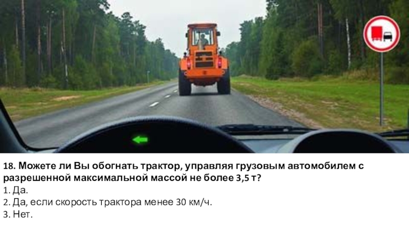 Слайд 4918. Можете ли Вы обогнать трактор, управляя грузовым автомобилем с разрешенной
