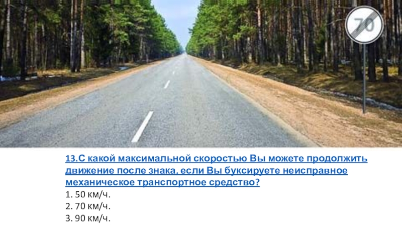 Слайд 2113.С какой максимальной скоростью Вы можете продолжить движение после знака, если
