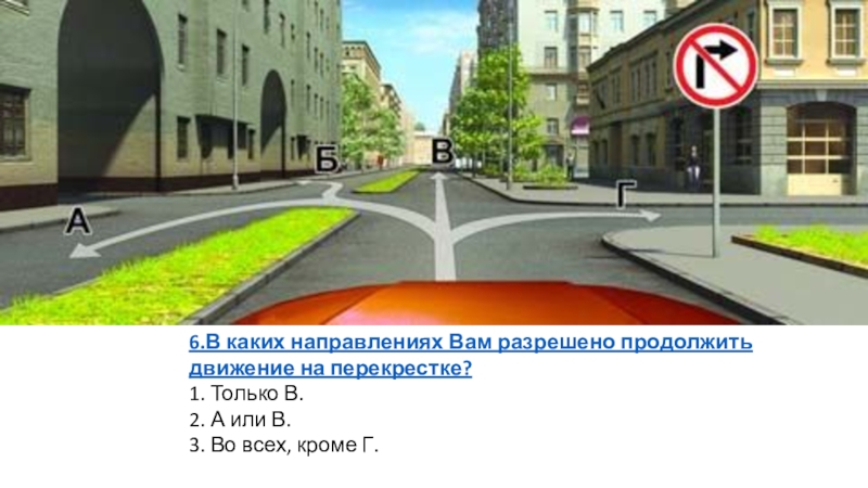 Слайд 146.В каких направлениях Вам разрешено продолжить движение на перекрестке?