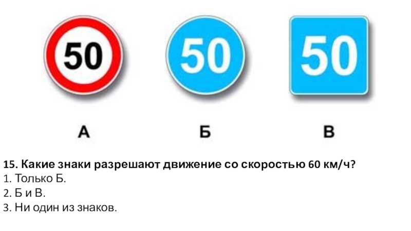 Слайд 4615. Какие знаки разрешают движение со скоростью 60 км/ч?