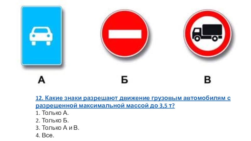 Слайд 2012. Какие знаки разрешают движение грузовым автомобилям с разрешенной максимальной массой