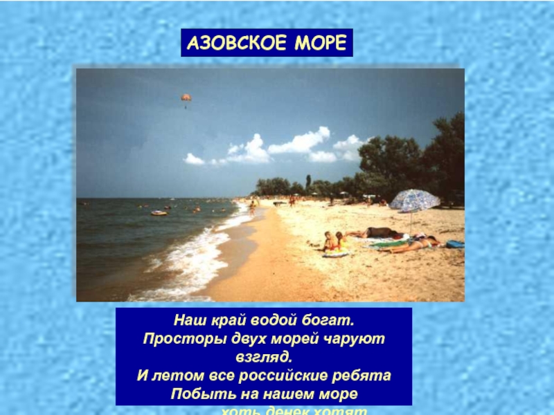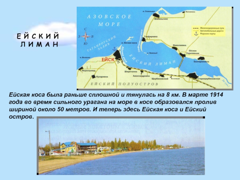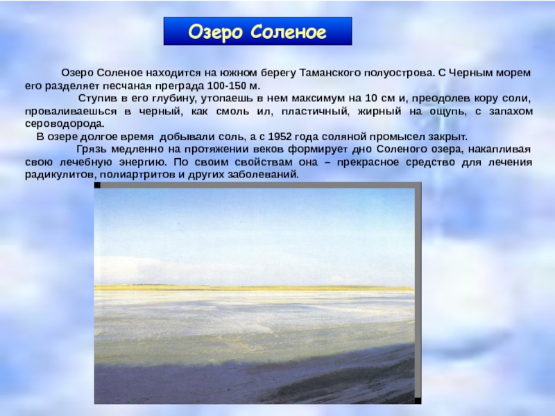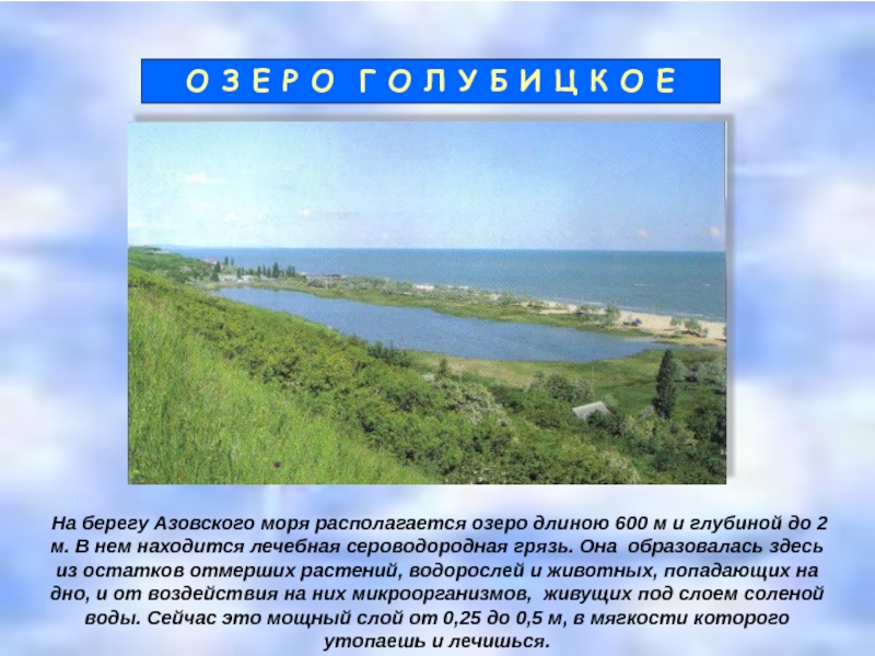 На берегу Азовского моря располагается озеро длиною 600 м и глубиной до 2 м. В нем находится лечебная сероводородная грязь. Она образовалась здесь из остатков отмерших растений, водорослей и животных, попадающих на дно, и от воздействия на них микроорганизмов, живущих под слоем соленой воды. Сейчас это мощный слой от 0,25 до 0,5 м, в мягкости которого утопаешь и лечишься.