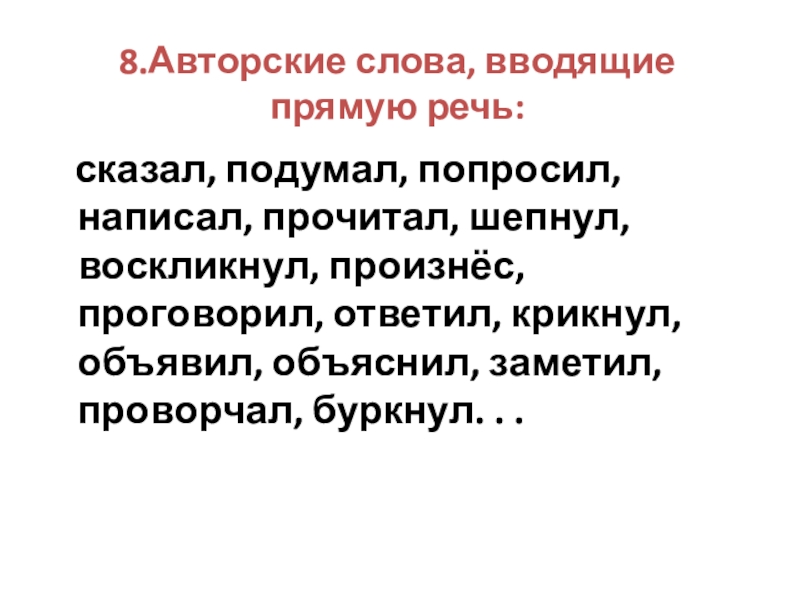 Слайд 118.Авторские слова, вводящие прямую речь: