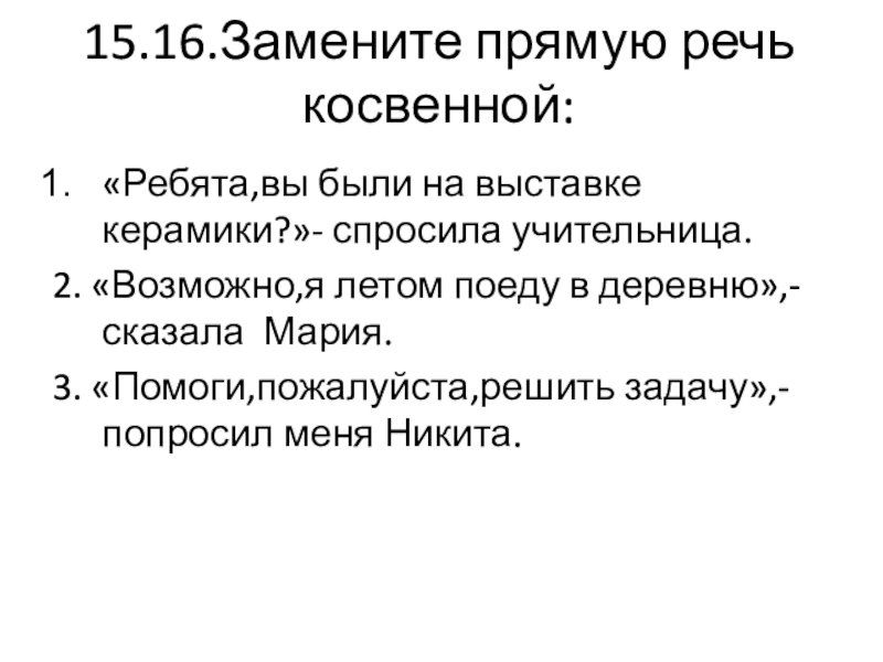 Слайд 2215.16.Замените прямую речь косвенной: