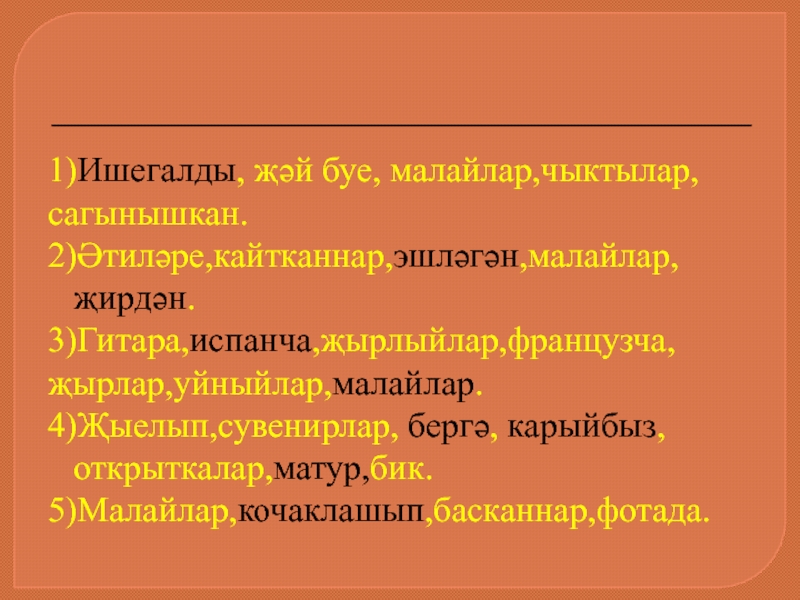 1)Ишегалды, җәй буе, малайлар,чыктылар,сагынышкан.2)Әтиләре,кайтканнар,эшләгән,малайлар, җирдән.3)Гитара,испанча,җырлыйлар,французча,җырлар,уйныйлар,малайлар.4)Җыелып,сувенирлар, бергә, карыйбыз,открыткалар,матур,бик.5)Малайлар,кочаклашып,басканнар,фотада.