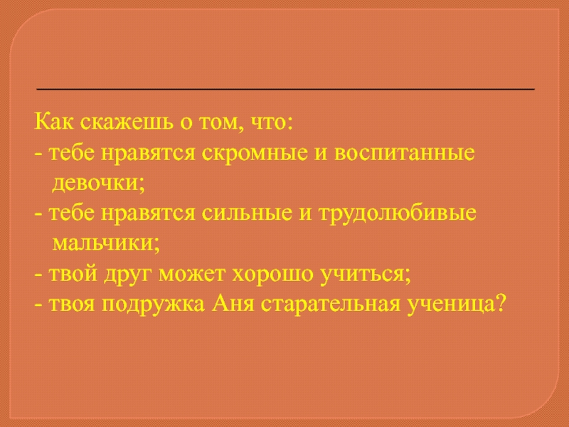 Как скажешь о том, что:- тебе нравятся скромные и воспитанные девочки;- тебе нравятся сильные и трудолюбивые мальчики;-