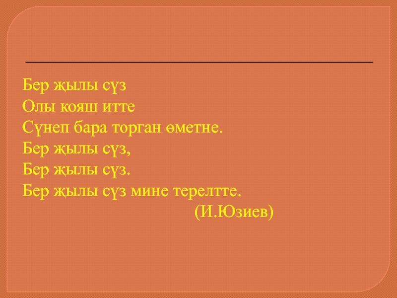 Бер җылы сүзОлы кояш иттеСүнеп бара торган өметне.Бер җылы сүз,Бер җылы сүз.Бер җылы сүз мине терелтте. (И.Юзиев)