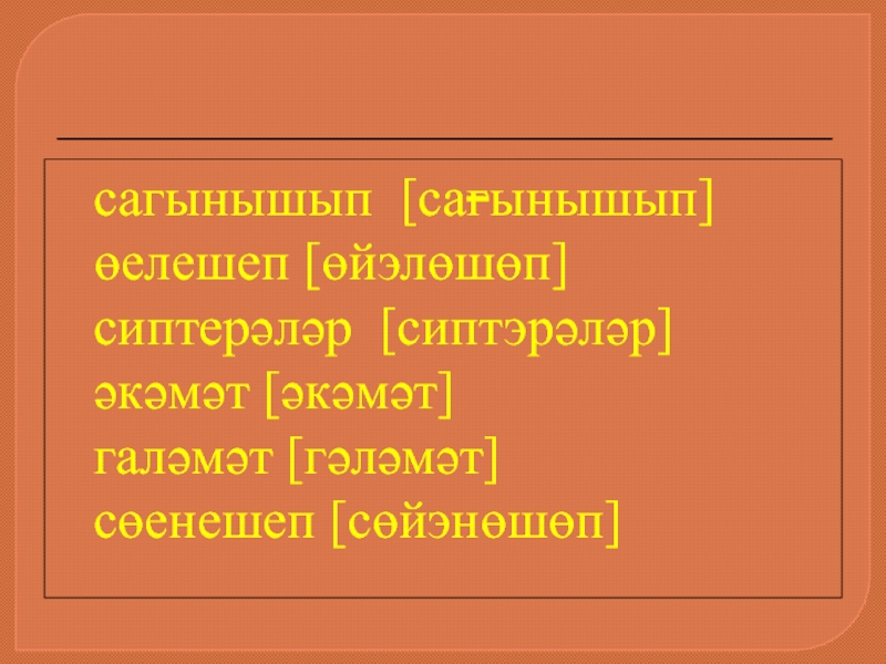 сагынышып [сагынышып]  өелешеп [өйэлөшөп]  сиптерәләр [сиптэрәләр]  әкәмәт [әкәмәт]  галәмәт [гәләмәт]