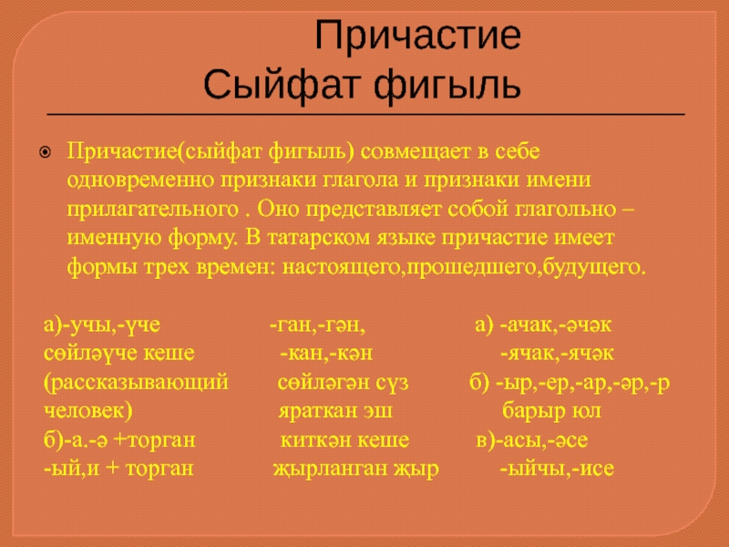 Причастие Сыйфат фигыльПричастие(сыйфат фигыль) совмещает в себе одновременно признаки глагола и признаки имени прилагательного . Оно представляет