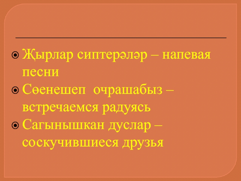 Җырлар сиптерәләр – напевая песниСөенешеп очрашабыз – встречаемся радуясьСагынышкан дуслар – соскучившиеся друзья