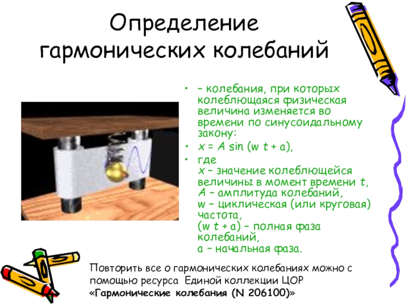 Повторить все о гармонических колебаниях можно с помощью ресурса Единой коллекции ЦОР «Гармонические колебания (N 206100)»