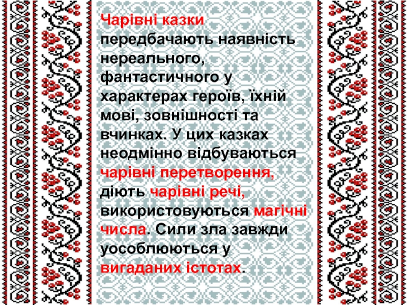 зовнішності та вчинках. У цих казках неодмінно відбуваються чарівні перетворення, діють чарівні речі, використовуються магічні числа. Сили зла завжди уособлюються у вигаданих істотах.