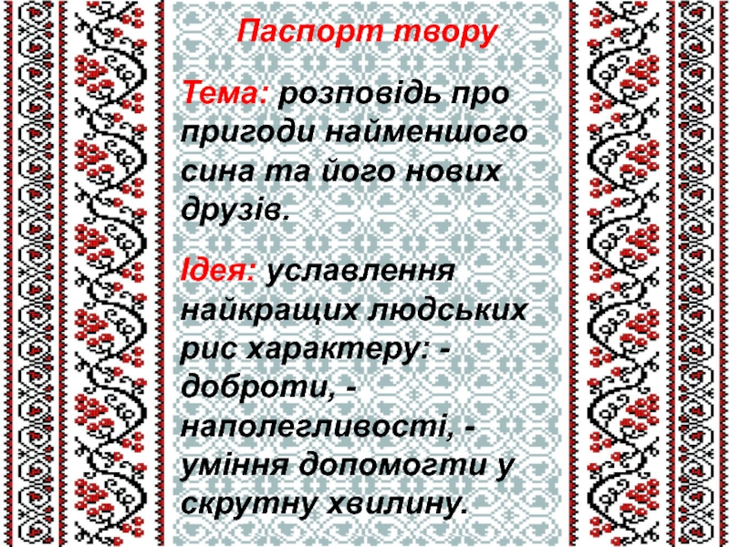 Паспорт творуТема: розповідь про пригоди найменшого сина та його нових друзів.Ідея: уславлення найкращих людських рис характеру: -доброти,