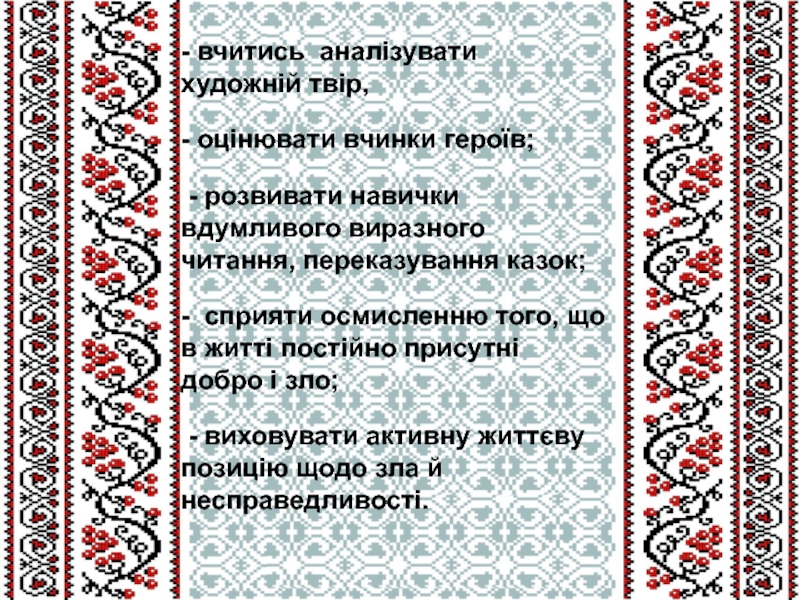 - вчитись аналізувати художній твір,- оцінювати вчинки героїв; - розвивати навички вдумливого виразного читання, переказування казок;- сприяти