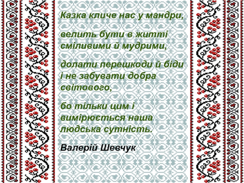 Казка кличе нас у мандри,велить бути в житті сміливими й мудрими,долати перешкоди й біди і не забувати