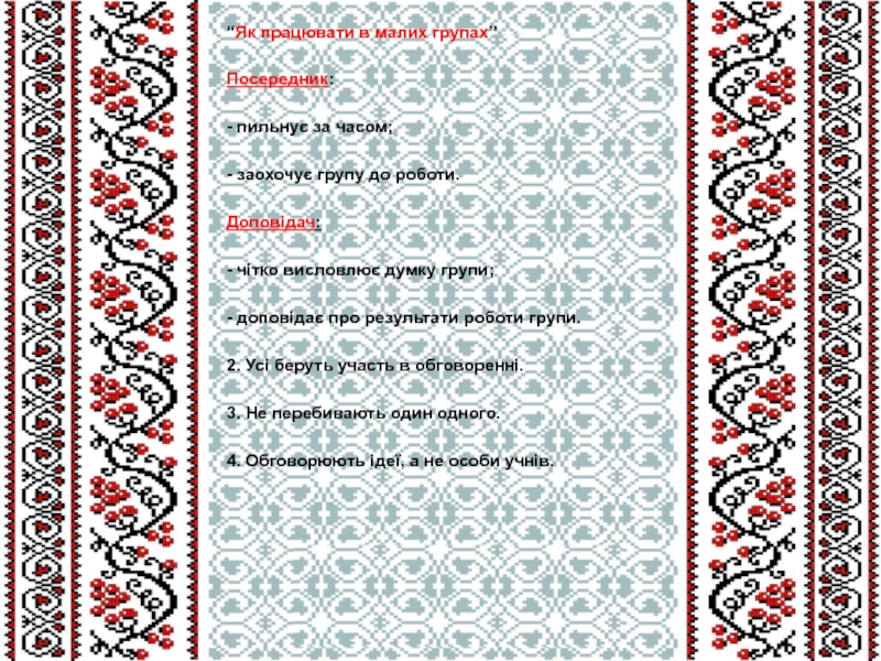 “Як працювати в малих групах”Посередник:- пильнує за часом;- заохочує групу до роботи.Доповідач:- чітко висловлює думку групи;- доповідає