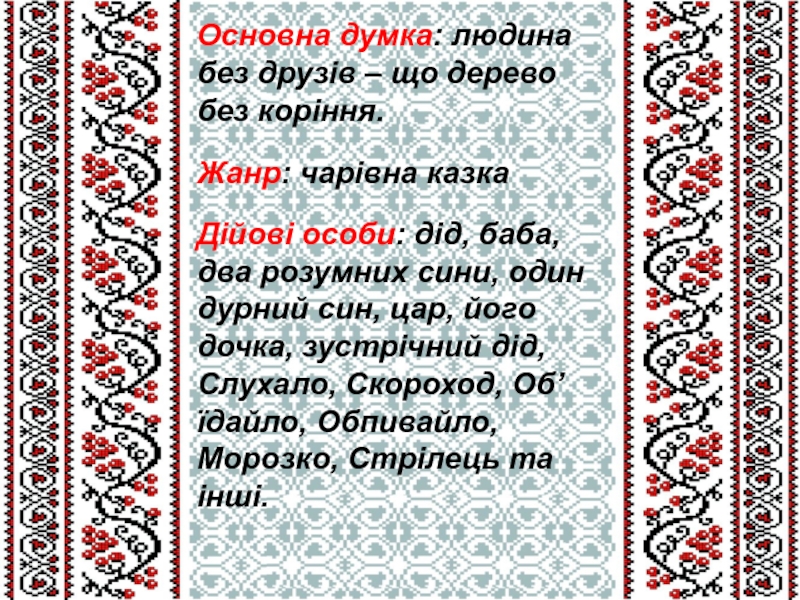 Основна думка: людина без друзів – що дерево без коріння.Жанр: чарівна казкаДійові особи: дід, баба, два розумних